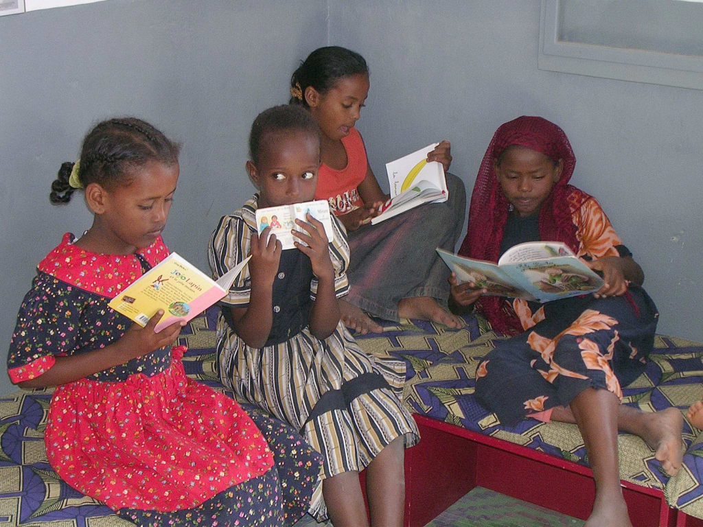 The library has story books, comics, novels, educational books, dictionaries and atlases, as well as Afar language books and Djiboutian-authored novels.